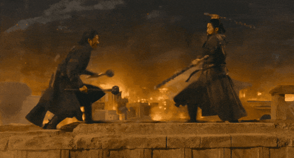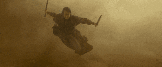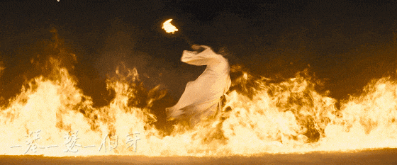 另一方面是打戏的场景创新,包括了风、沙、火、雪、夜等不同场景。比如剑锋裹上火油,两人在火海里对砍;在漫天沙暴里,双鞭对单剑,逆风时寸步难行,顺风时借力发招,可以说把大自然也拉来当武指了。