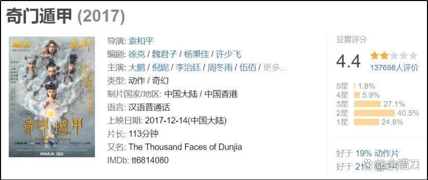 豆瓣7.5分的本届春节档最高评分,更是让人意外。要知道,豆瓣对武侠、动作电影十分严苛,被评为《卧虎藏龙》之后最好的武侠片的《剑雨》,也只有7.7分。