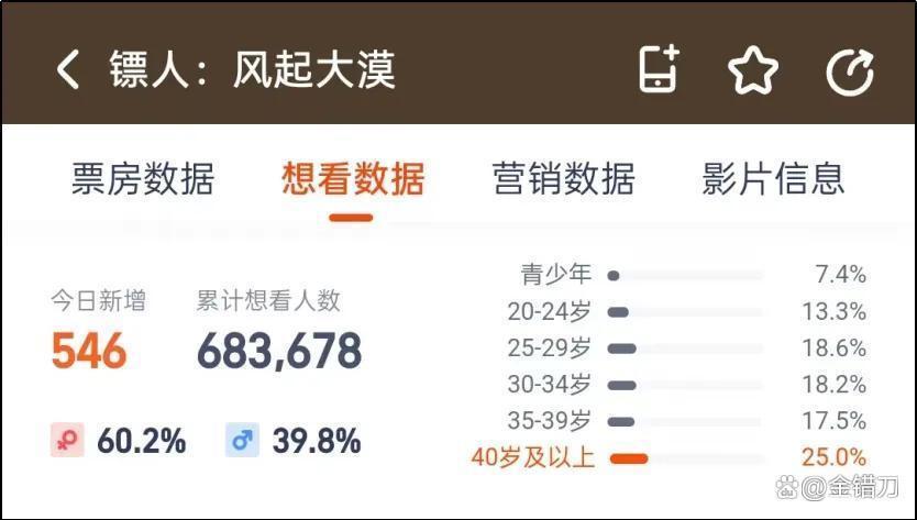 “吴京+谢霆锋+李连杰”的打星组合,很难撬动作为观影主力军的年轻人。根据灯塔专业版的数据,《镖人》想看数据里,40岁及以上人群占比最大。
