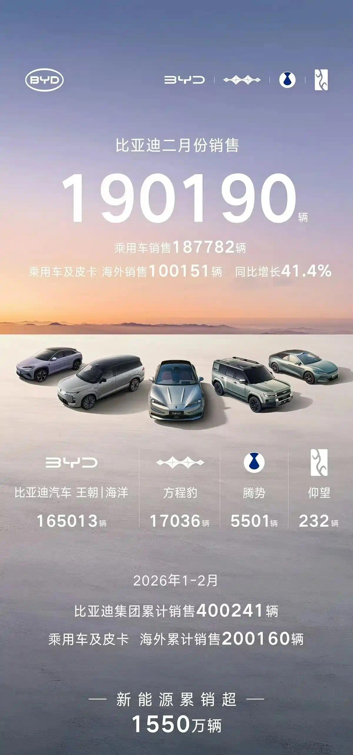 累计方面,今年1-2月比亚迪集团累计销售400241辆,同比下降35.8%;乘用车及皮卡海外累计销售200160辆,占比近五成,全球化势头强劲。