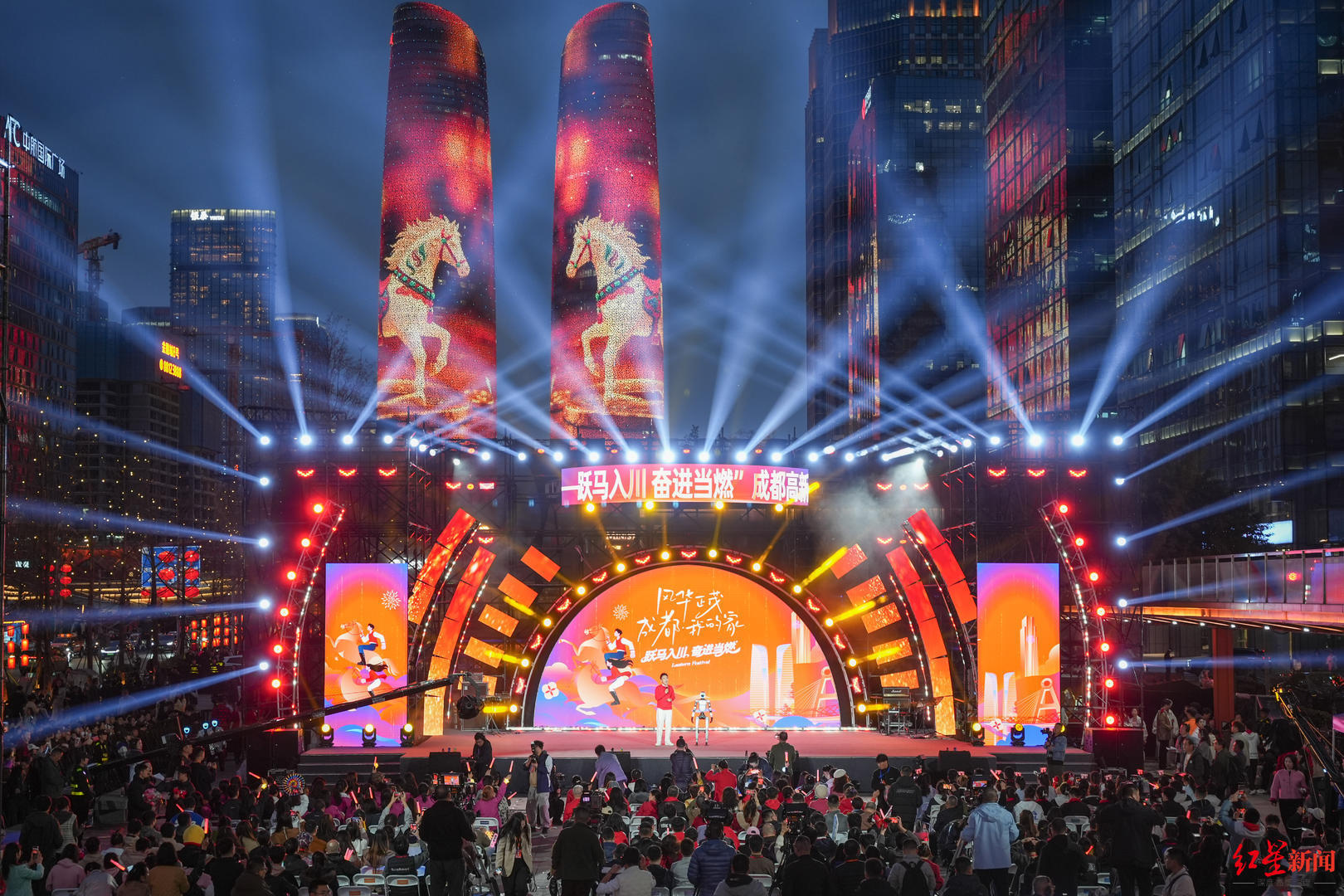 当晚,“风华正茂 成都我的家——跃马入川 奋进当燃”成都高新区2026年元宵节主题活动在交子大道精彩上演。近50家企业奋进宣言点亮5.2万平方米天府双塔巨幕,青年人才携手AI唱响未来,线上线下91家企业带来优质岗位……作为连续三年打造的城市级IP活动,本届元宵节活动以人才为主角、企业站C位,创新“1+4+N”形式,打造了1场天府双塔光影秀,青年人才元宵歌会、元宵星空招聘市集、青年兴趣社交活动、元宵主题游园会4场青年人才风采展示,以及N场商圈联动促消费活动,呈现出一幅科技感、青春力与烟火气交融的城市图景。