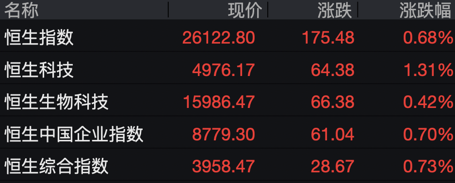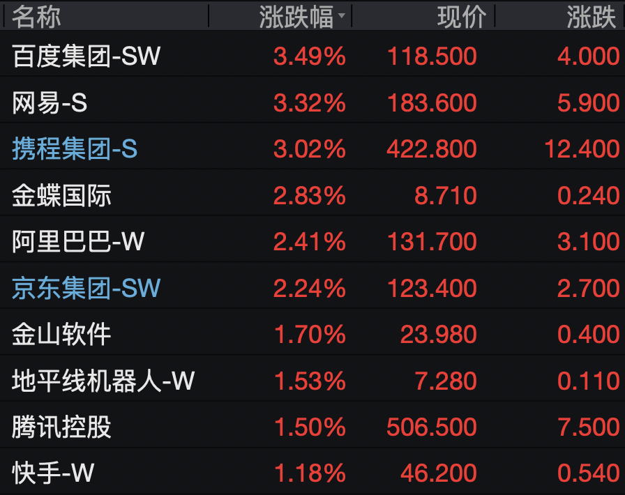 大型科网股活跃,百度集团、网易、携程集团涨逾3%,阿里巴巴、京东集团涨逾2%,金山软件、腾讯控股、快手等均涨超1%。
