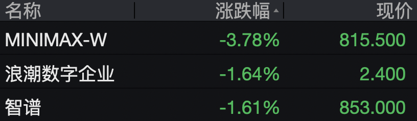 AI大模型概念股开盘表现低迷,MINIMAX-W跌超3%,智谱跌超1%。