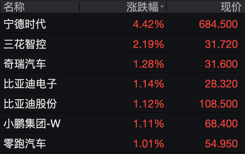 新能源汽车板块涨幅居前,宁德时代涨逾4%,三花智控涨超2%,奇瑞汽车、比亚迪股份、小鹏集团、零跑汽车均走高。