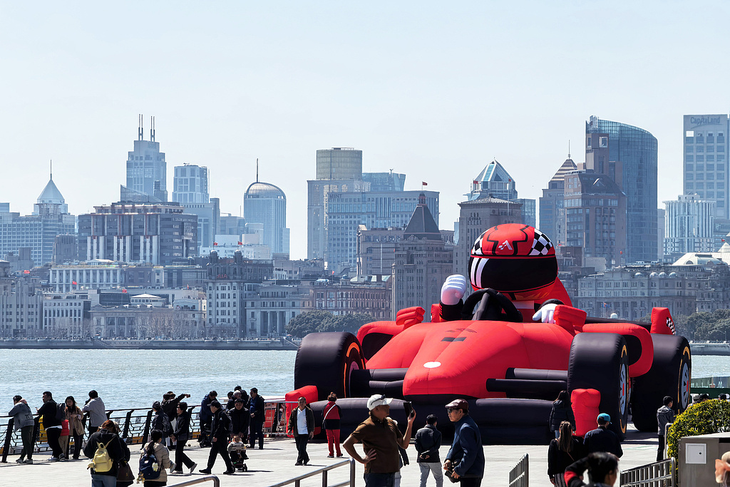 2026年3月14日,上海,一辆巨型“F1赛车”停靠在黄浦江畔。视觉中国 图
